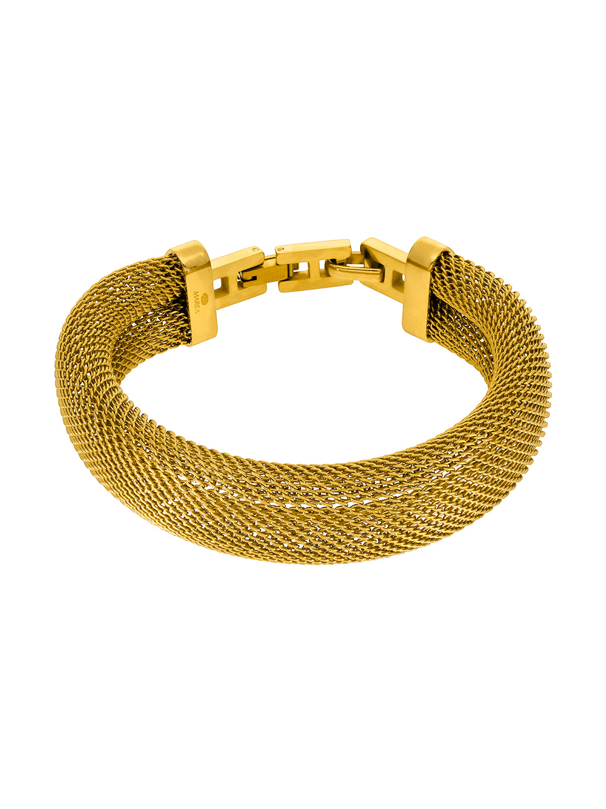 Pulsera malla con cierre mosquetón. Versión en acero dorado.