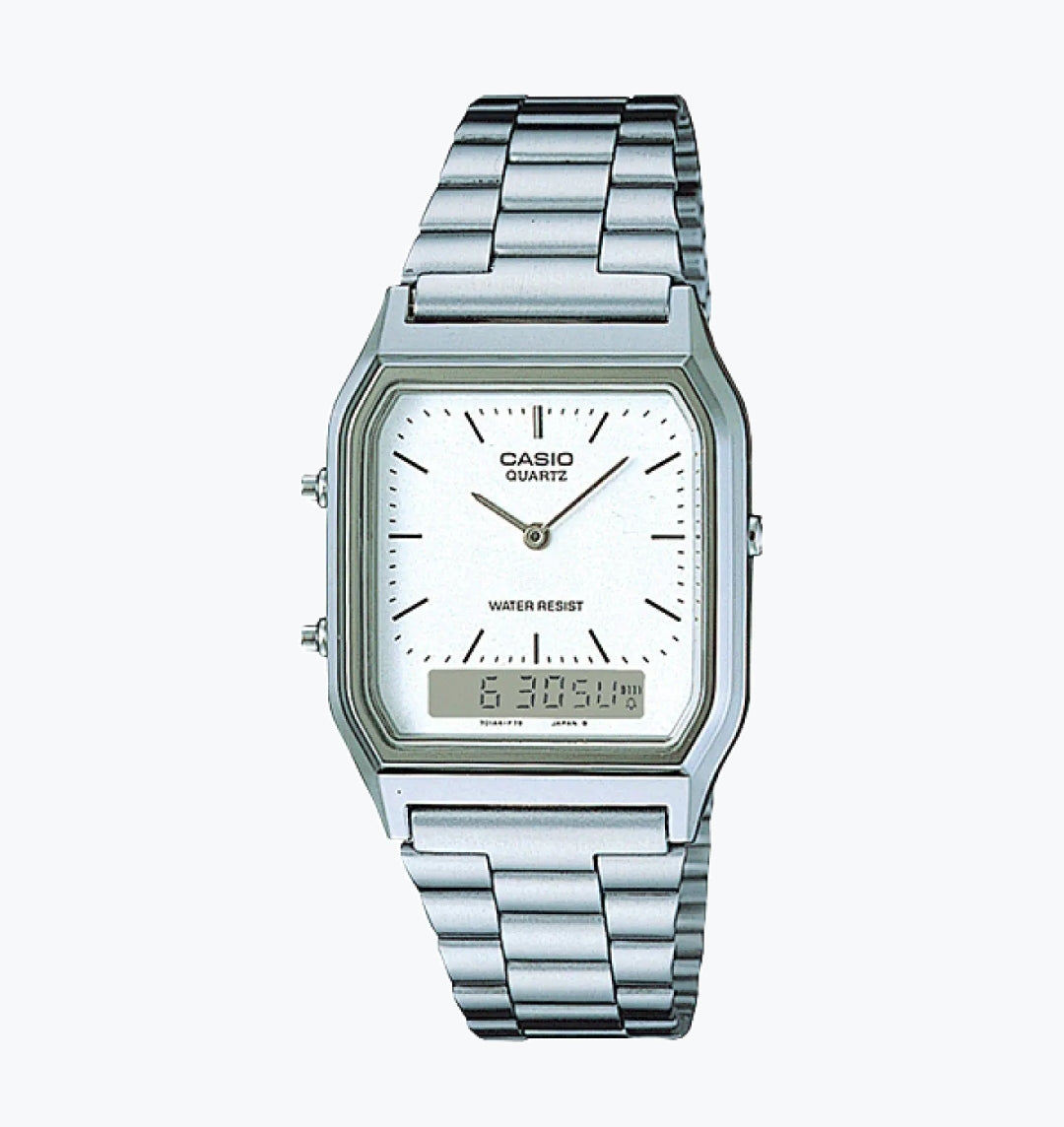 Una caja metálica de diseño anguloso, absolutamente estilizada, combinada con una elegante correa metálica, confiere a este reloj un aspecto único. La esfera mezcla hábilmente una pantalla LCD con una pantalla analógica con agujas de horas y minutos. Un auténtico clásico que lleva casi 30 años arrasando en las listas de relojes y que promete una elegancia atemporal con su diseño minimalista.